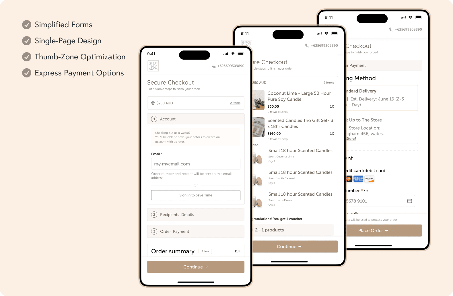 Mobile-First Checkout: We eliminated unnecessary fields, added clear progress indicators, and optimized every element for one-thumb operation. Express payment options for returning customers. Smart address autocomplete to reduce typing.