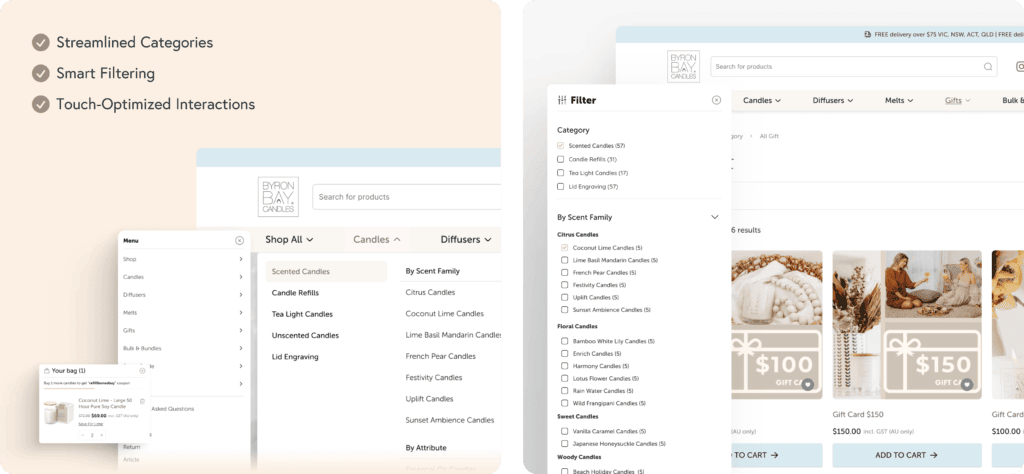 Smart Category Structure: We consolidated overly specific categories into logical groups, then added intelligent filtering. Shopping for candles? Filter by scent family (woody, fresh, floral), size (travel, standard, luxury), or purpose (relaxation, energizing, ambiance). Each category got filters that actually mattered to buyers.