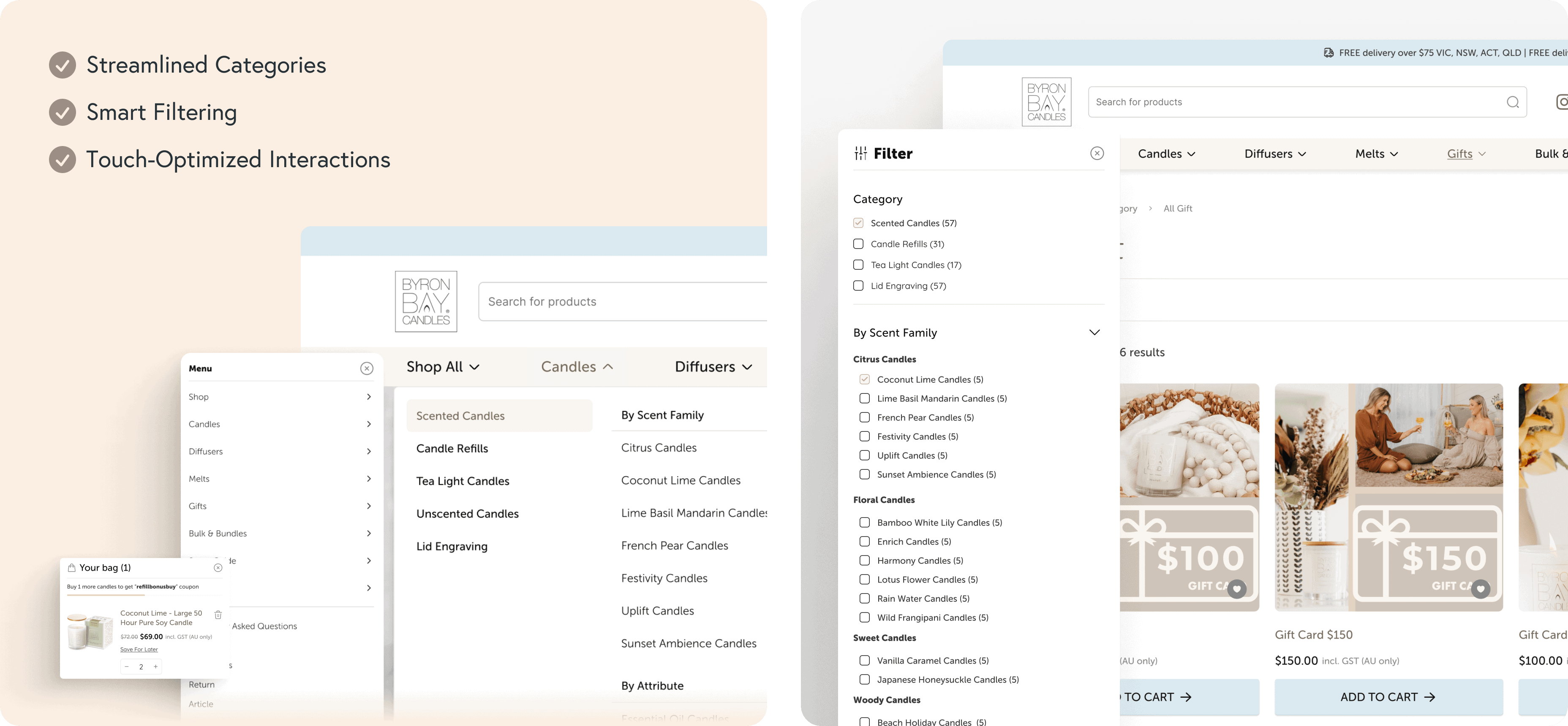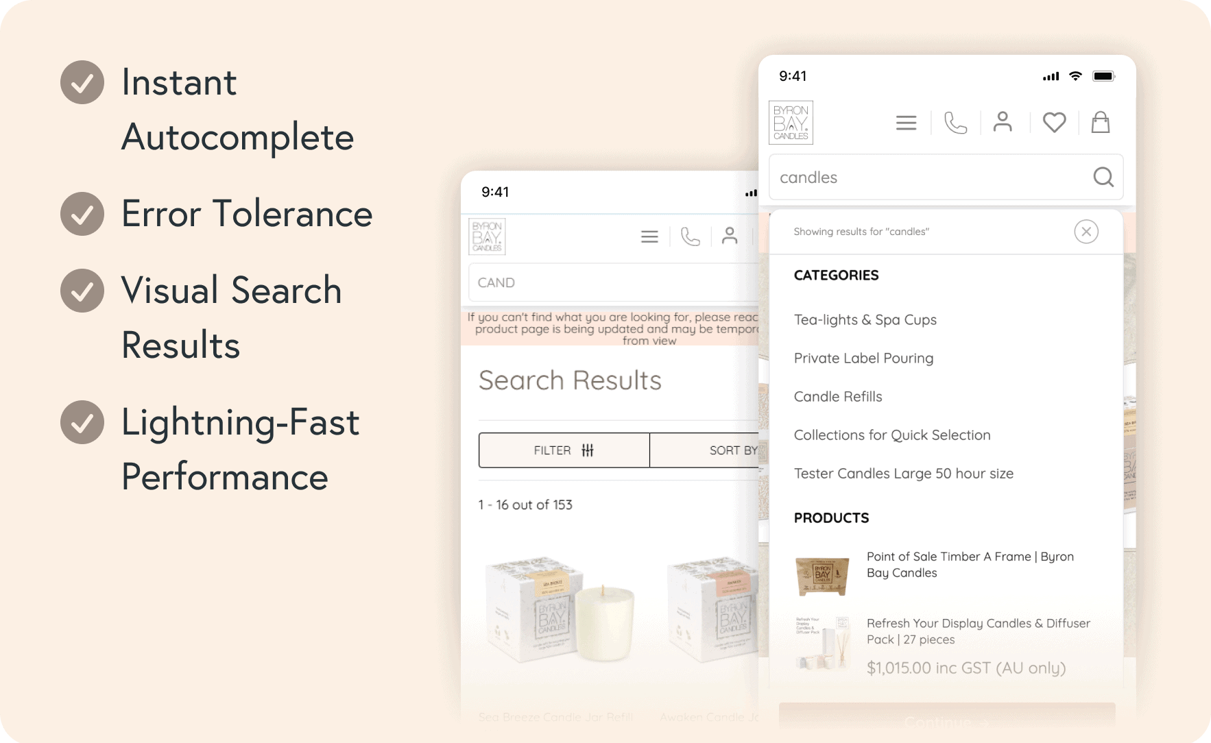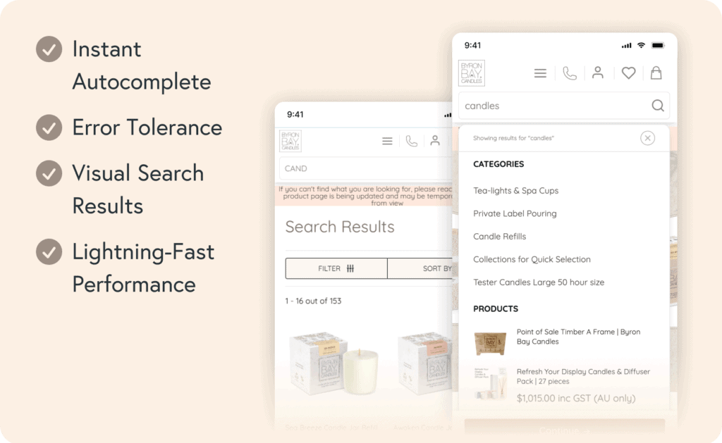 - Search That Failed: With 40% of ecommerce users preferring search, Byron Bay Candles was hemorrhaging potential sales. The search delivered limited results, couldn’t handle misspellings, and lacked visual feedback about result counts.