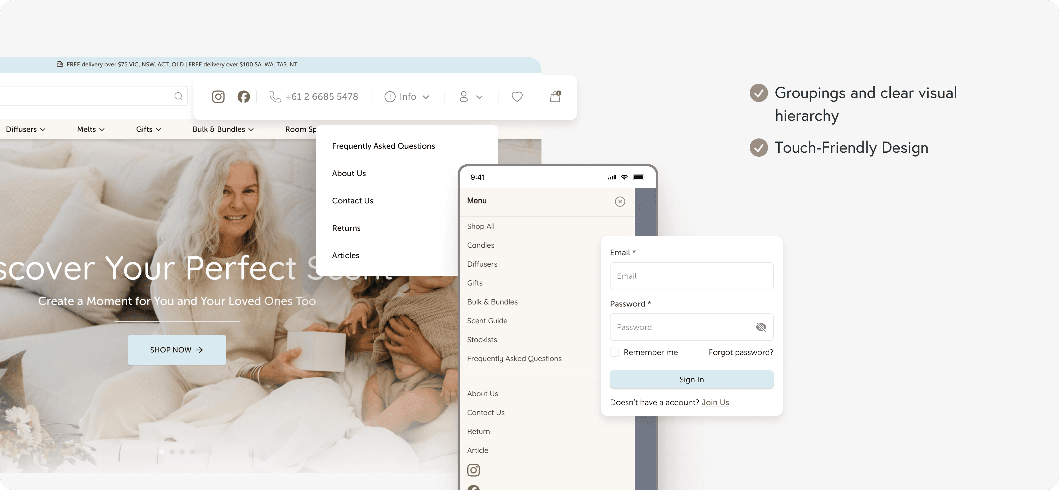 Navigation Clarity: We separated product navigation from courtesy links. Product categories stayed prominent and thumb-accessible. Account, contact, and policy links moved to logical secondary positions. No more cognitive overload.