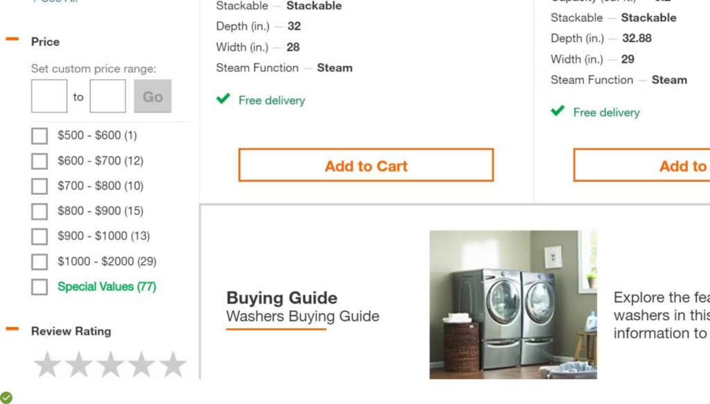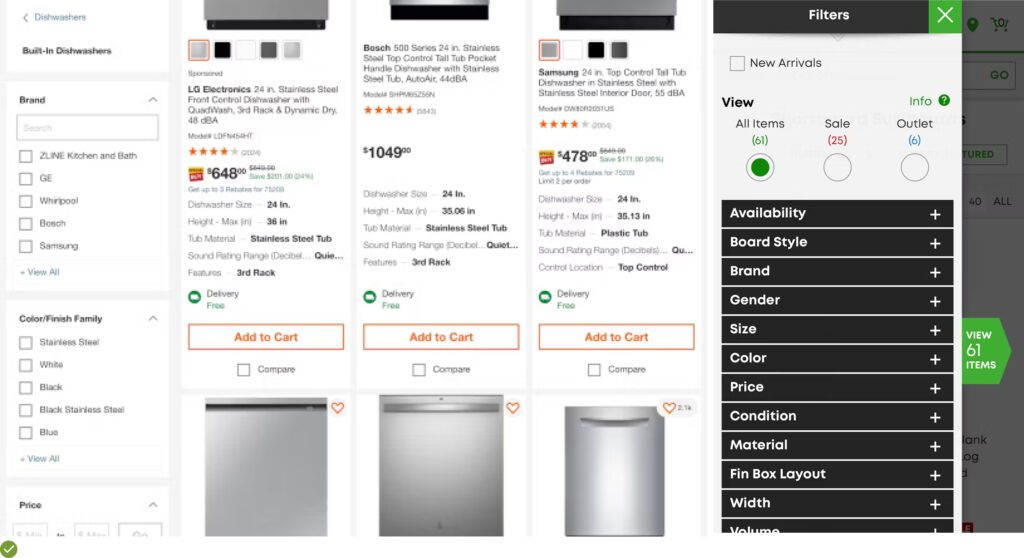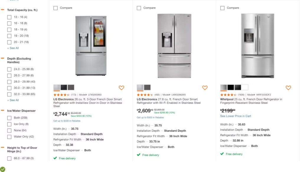 Example: Home Depot’s “Best Match” sort type features a range of refrigerators in different sizes, finishes, and price points, effectively showcasing the category’s diversity.
