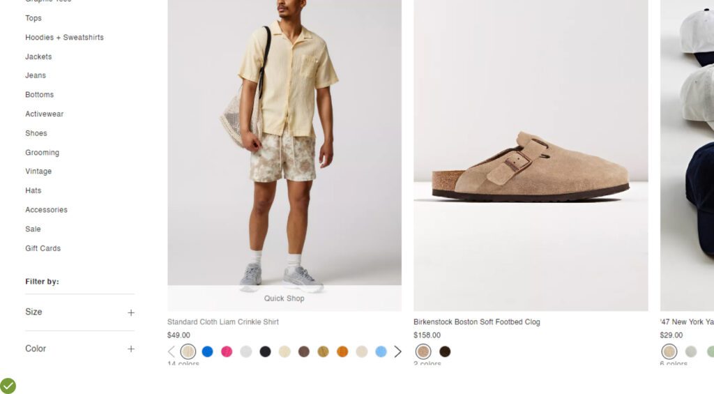 Example: If list items offer sufficient product information and clear thumbnails, “Quick Views” become unnecessary. For instance, Urban Outfitters places their “Quick View” link (“Quick Shop”) at the thumbnail bottom, minimizing accidental clicks. Ensure a prominent link or button leading to the product page is provided within the “Quick View”, with the product list visible behind the “Quick View” overlay for clarity.
