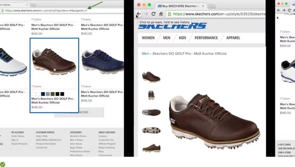 Example:: Skechers.com has an effective “Load More” functionality that amends the URL every time a user clicks the button. As a result, when users press the browser’s “Back” button from a product page, they are returned to their original position in the product list (e.g., “page 3”).