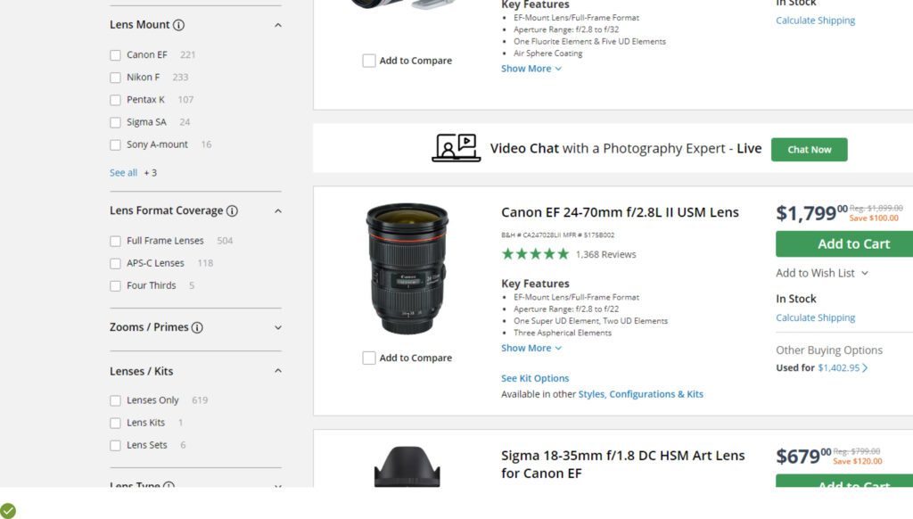 Example: On B&H Photo, novice photographers can easily understand the critical aspects of camera lenses by viewing the filter types. This allows them to refine their search until they identify the lenses that match their preferences.