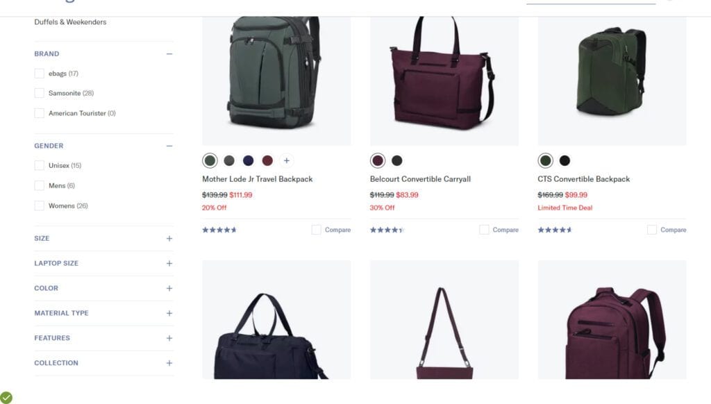 Example: eBags has a “Device Type” filter that allows users to quickly find laptop bags and cases suitable for their devices. Such a filter greatly reduces the time spent searching for compatible products, boosting user satisfaction.