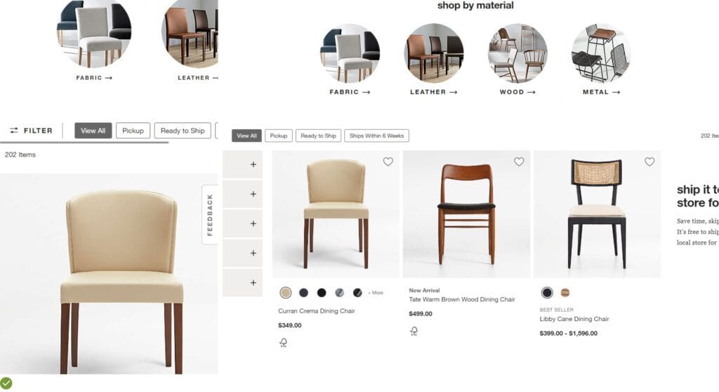 Example: The “Chairs” subcategory at Crate & Barrel isn’t subdivided, allowing customers to easily view the full extent of the catalog.