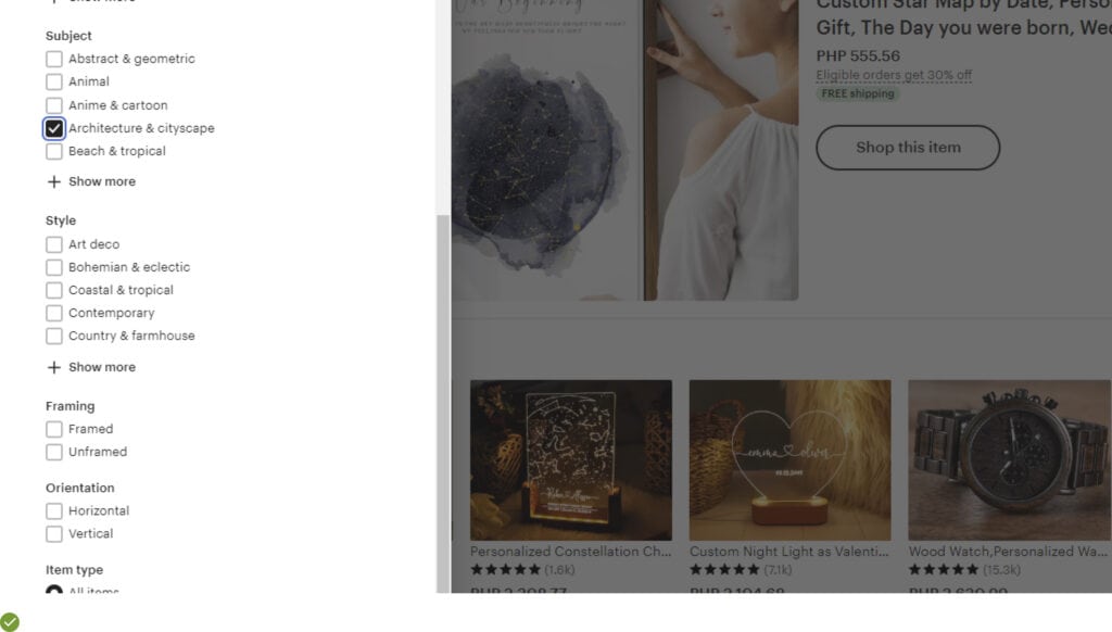Example: On Etsy, users can conveniently sort products based on shipping specifics like “Free Shipping” or “Ready to ship within 1 business day.” This feature lets customers who need quick delivery to focus only on products that meet their timeframe, enhancing their shopping experience.
